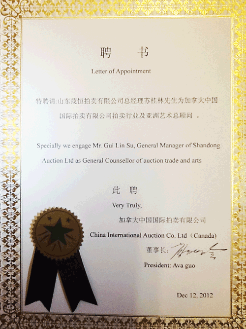 公司总经理受聘于加拿大中国国际拍卖有限公司