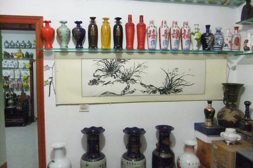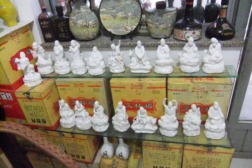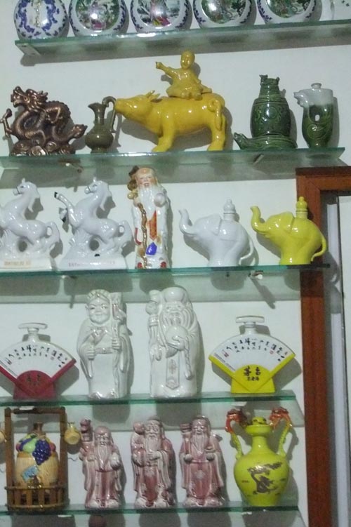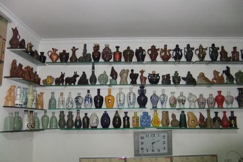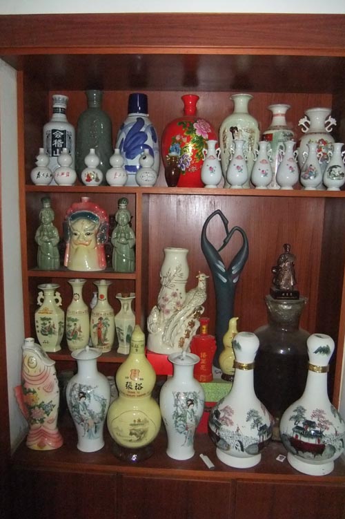 酒瓶商标美,可看到祖国美好河山,如万里长城、西湖胜景、桂林山水、曲阜孔庙、天安门华表等,还可欣赏到诗词美、书法美。在材质美方面,近年除用的玻璃、陶瓷大有变化之外,还用到竹、木、让人品味到问归自然的气息,在馐盒上,也看到各种美术设计之美……他收藏的酒瓶从质地上讲有陶瓷、玻璃、木制、贝壳做的;从造型上讲有二龙戏珠、李白醉酒、倒挂金钟,方的、圆的、扁的、大的、小的……从产地上讲,是从全国20多个省搜罗来的,真是令人目不暇接、大开眼界。“展览馆”里最引人注目的要数一套《西游记》师徒造型的酒瓶,四个西天取经的大和尚肚里装满了酒,不知佛祖是否见怪!